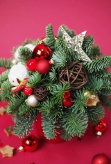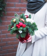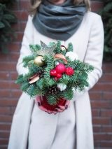 Живые ветви ароматной ели устанавливаются в специальный материал, пропитанный водой - это позволяет изделию держать форму и сохранять свежесть как можно дольше. Украшения аккуратно крепим на специальный клей (не обходится и без особой флористической магии, конечно).