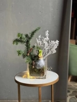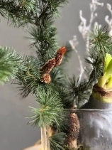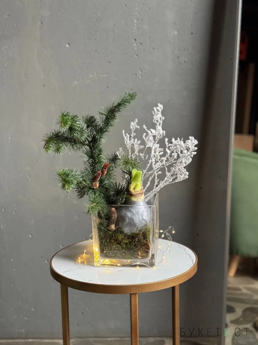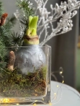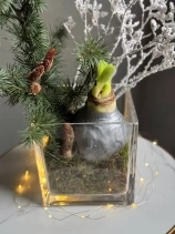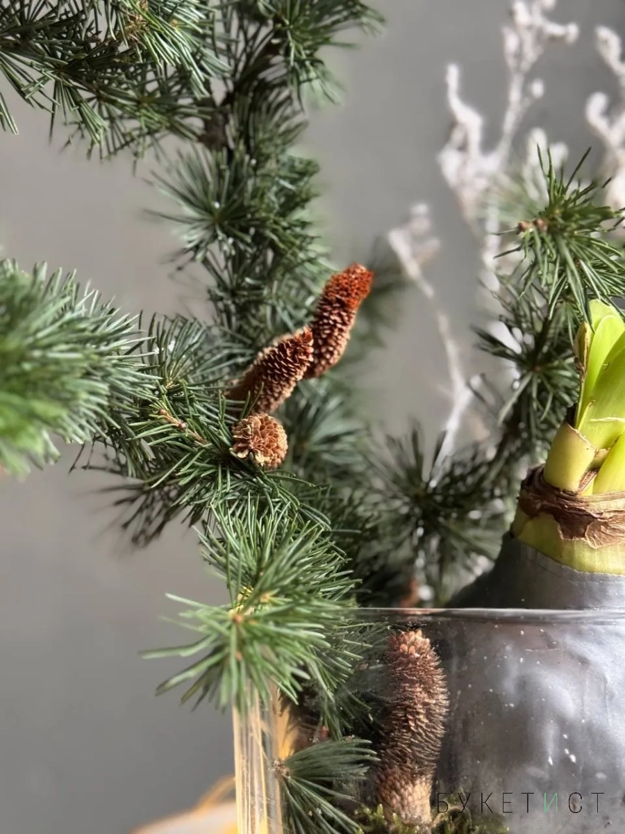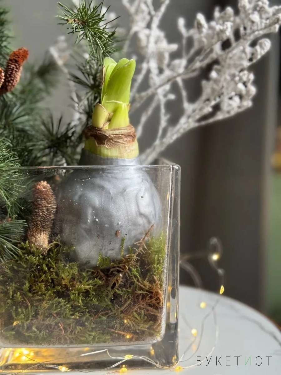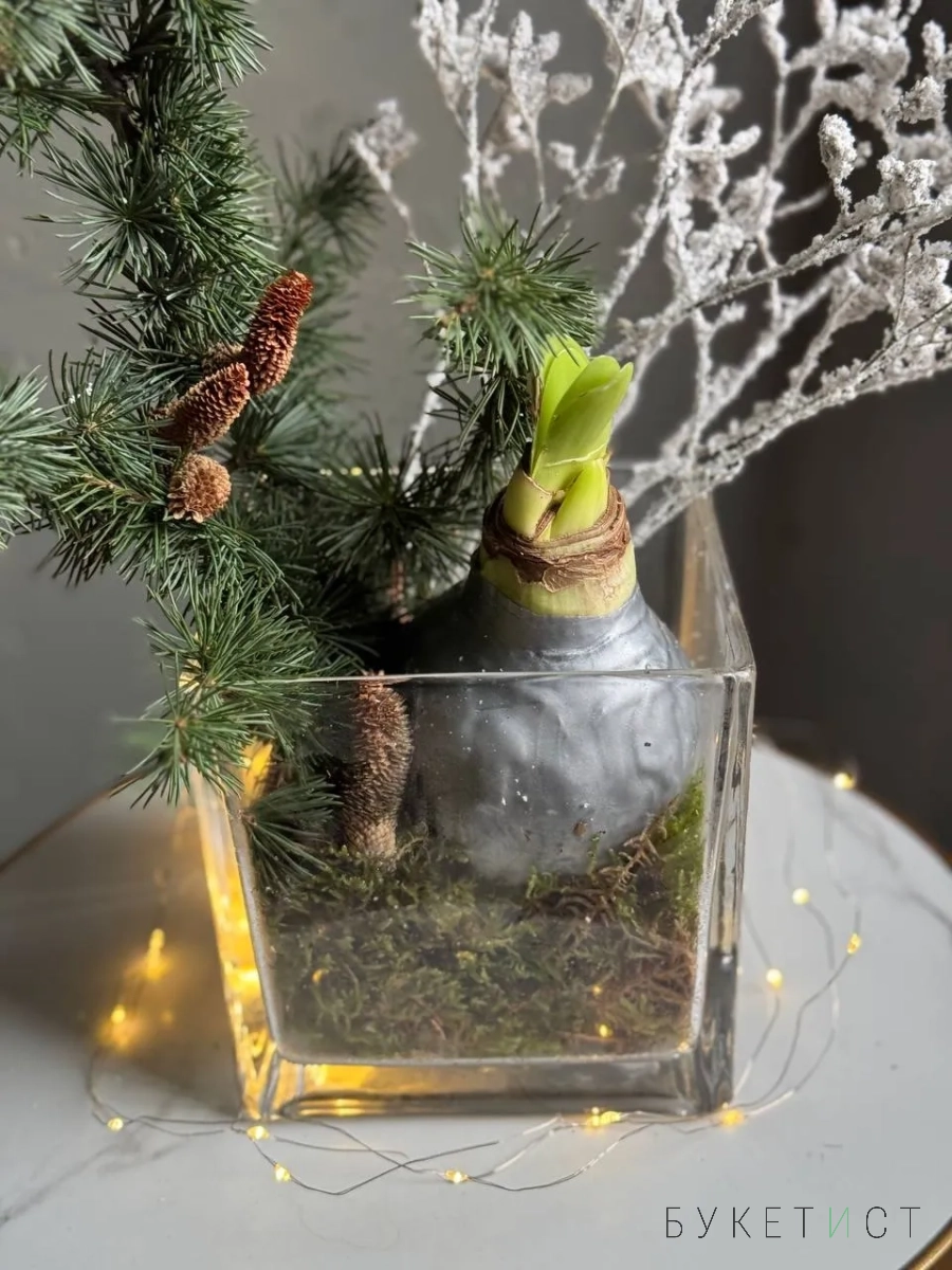 Композиция в квадратном кашпо с натуральными шишками и луковицей амариллиса