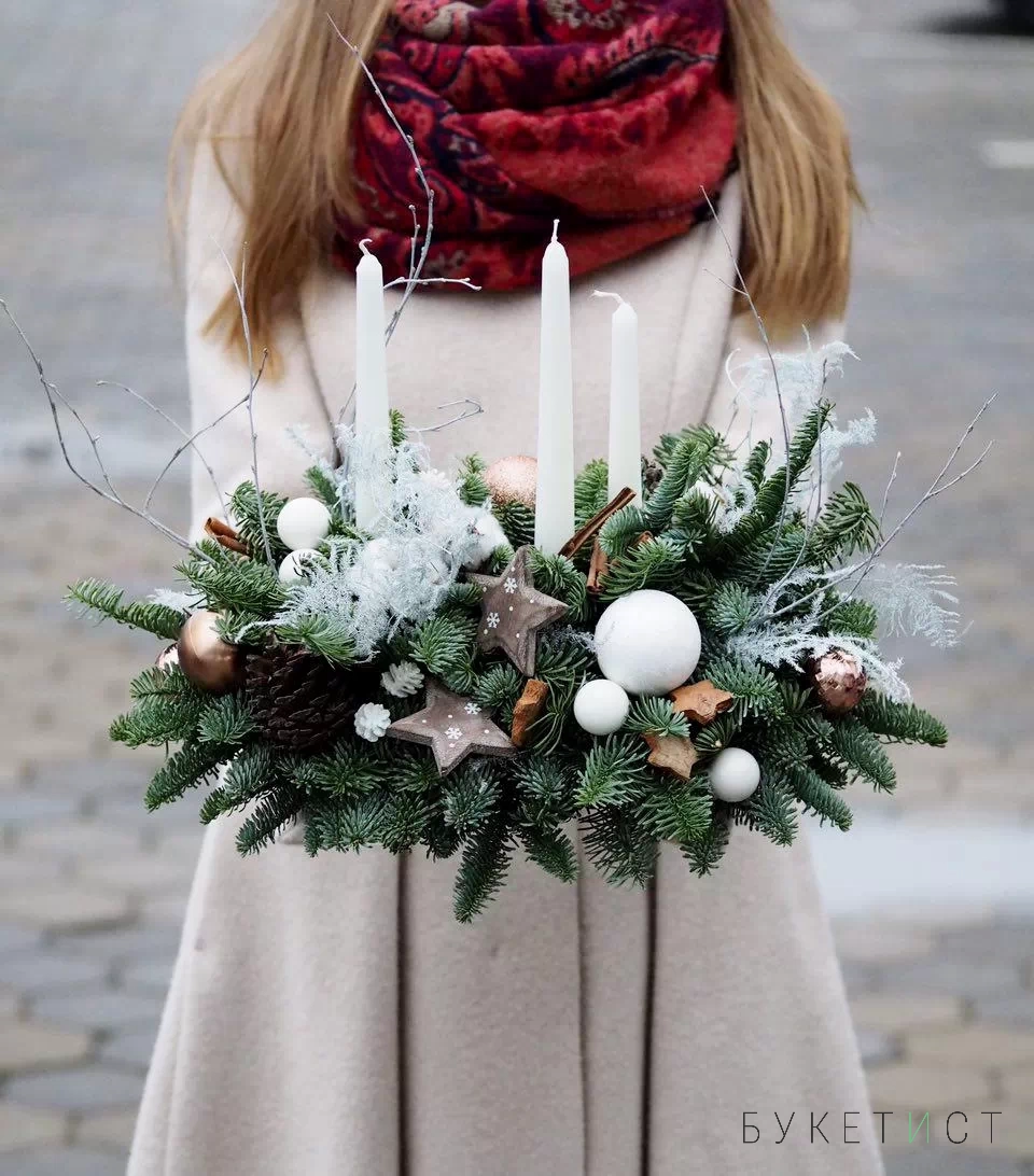 Каждая композиция создаётся заботливыми руками наших фей-флористов: живые ветви ароматной ели устанавливаются в специальный материал, пропитанный водой - это позволяет изделию держать форму и сохранять свежесть как можно дольше. Свечи добавляют особого волшебства - совсем как в рождественском кино ❤️