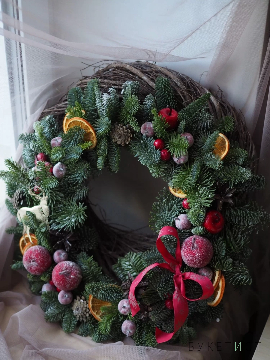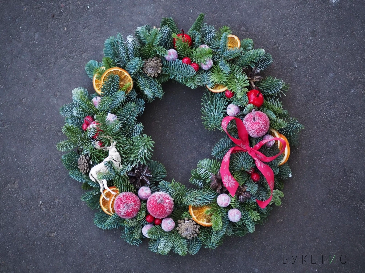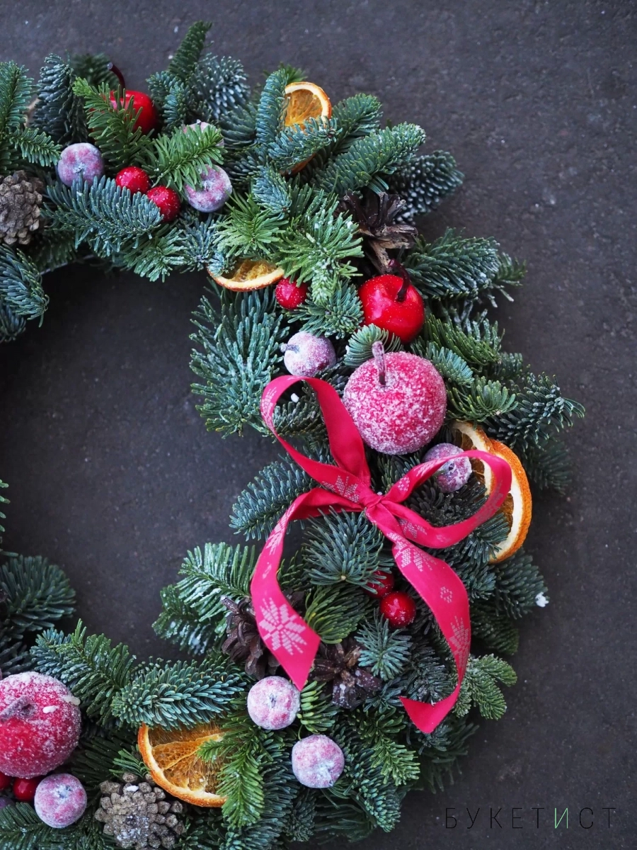 Мы в Букетисте работаем с датской елью самого высокого качества — наши феи-флористы вручную плетут каждый веночек, отбирая лучшие еловые ветви. Украшения аккуратно крепим на специальный клей (не обходится и без особой флористической магии, конечно). Венок можно положить на праздничный стол или повесить над входной дверью. Если вы отмечаете на даче - получится совсем как в рождественском кино.
