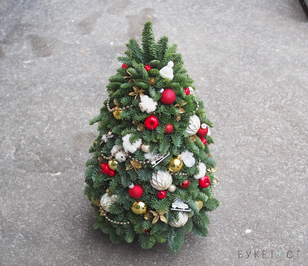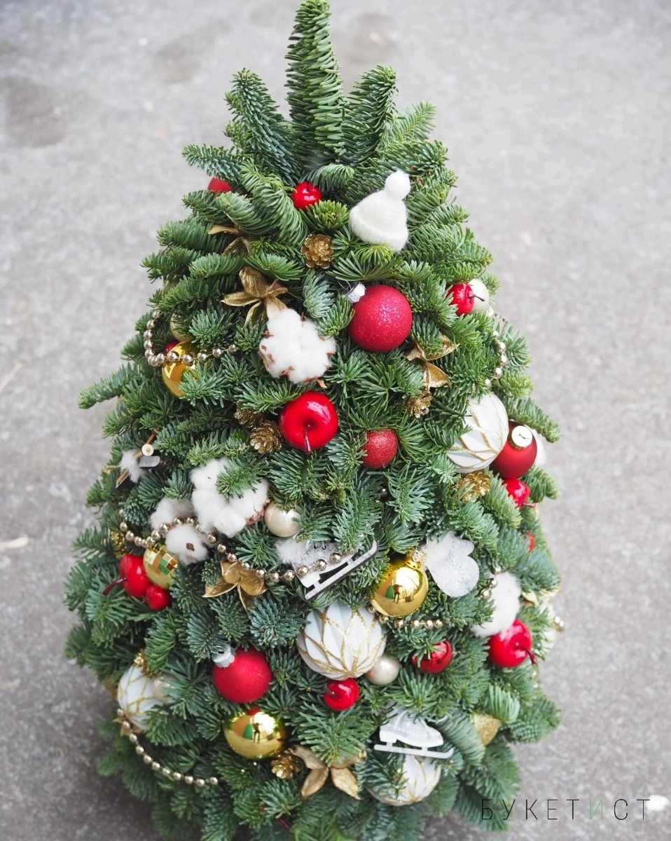 Каждая ёлочка создаётся волшебными руками наших фей-флористов: живые ветви ароматной ели устанавливаются в специальный материал, пропитанный водой - это позволяет изделию держать форму и сохранять свежесть как можно дольше. Украшения аккуратно крепим на специальный клей - уровень эстетического удовольствия просто зашкаливает ❤️