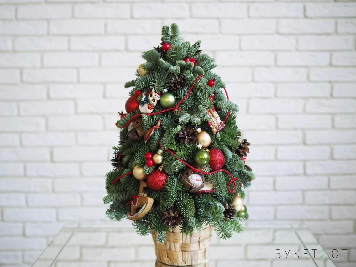 Новогодняя елочка из натуральной хвои с винтажными игрушками в кашпо