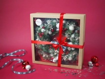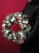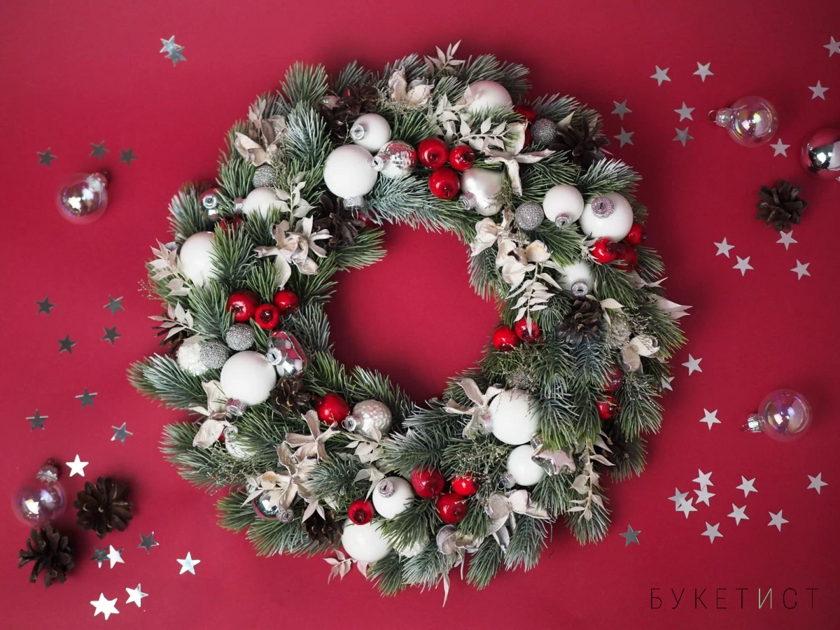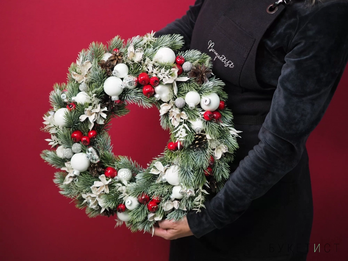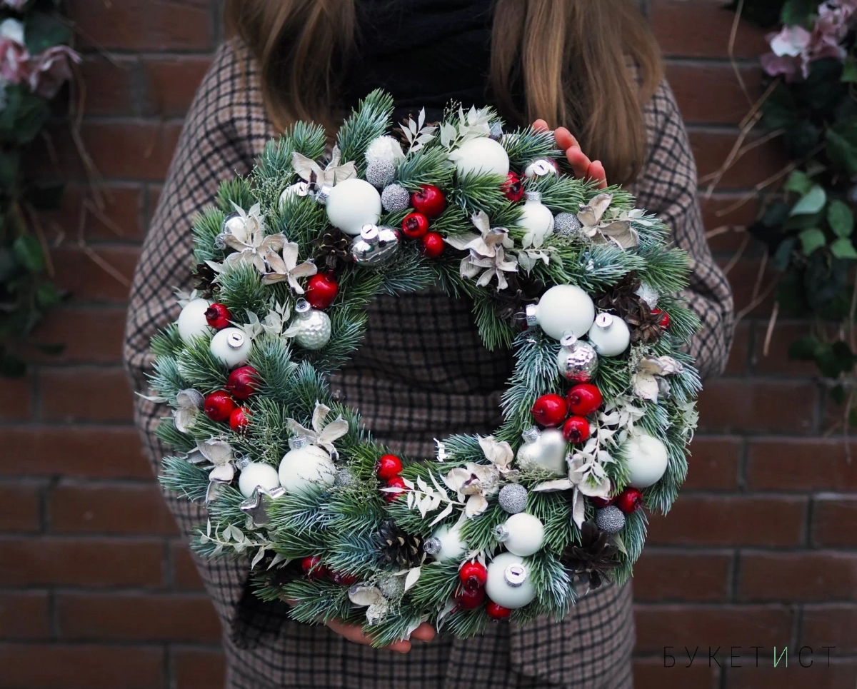 Мы в Букетисте работаем с датской елью самого высокого качества — наши феи-флористы вручную плетут каждый веночек, отбирая лучшие еловые ветви. Украшения аккуратно крепим на специальный клей (не обходится и без особой флористической магии, конечно). Венок можно положить на праздничный стол или повесить над входной дверью. Если вы отмечаете на даче - получится совсем как в рождественском кино.