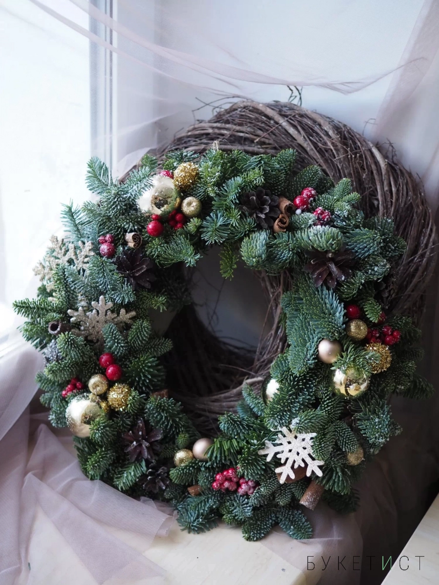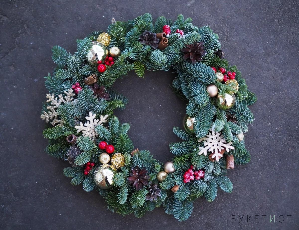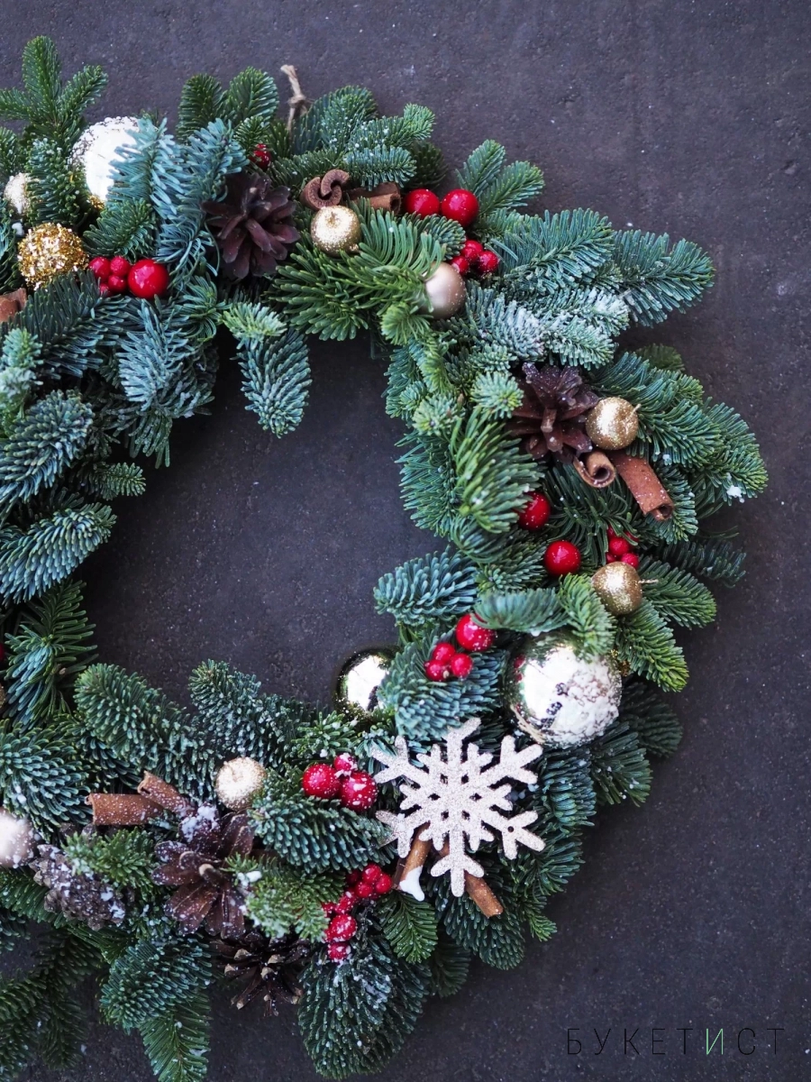 Мы в Букетисте работаем с датской елью самого высокого качества — наши феи-флористы вручную плетут каждый веночек, отбирая лучшие еловые ветви. Украшения аккуратно крепим на специальный клей (не обходится и без особой флористической магии, конечно). Венок можно положить на праздничный стол или повесить над входной дверью. Если вы отмечаете на даче - получится совсем как в рождественском кино.