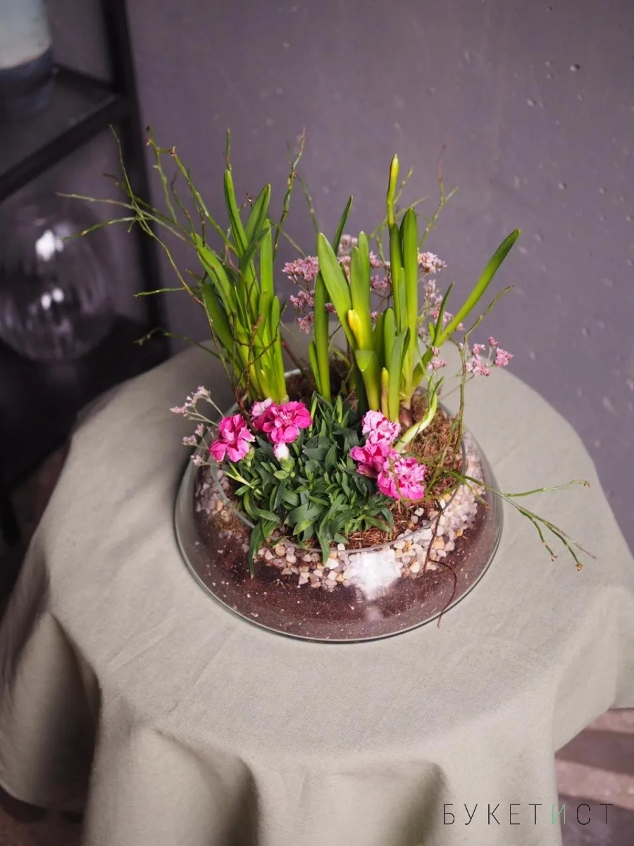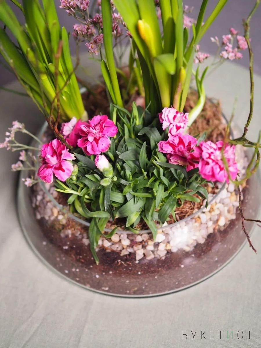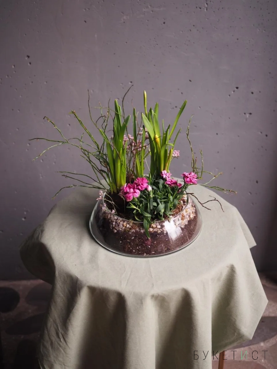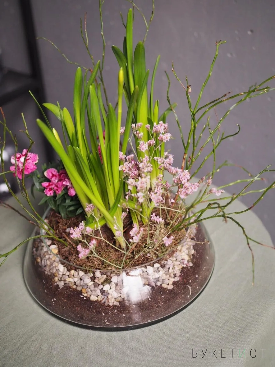 Утонченная авторская композиция к весне в стеклянном кашпо. Это не просто емкость для цветов, а полноценный элемент декора для вашего дома.
