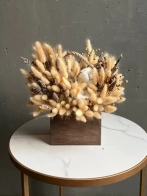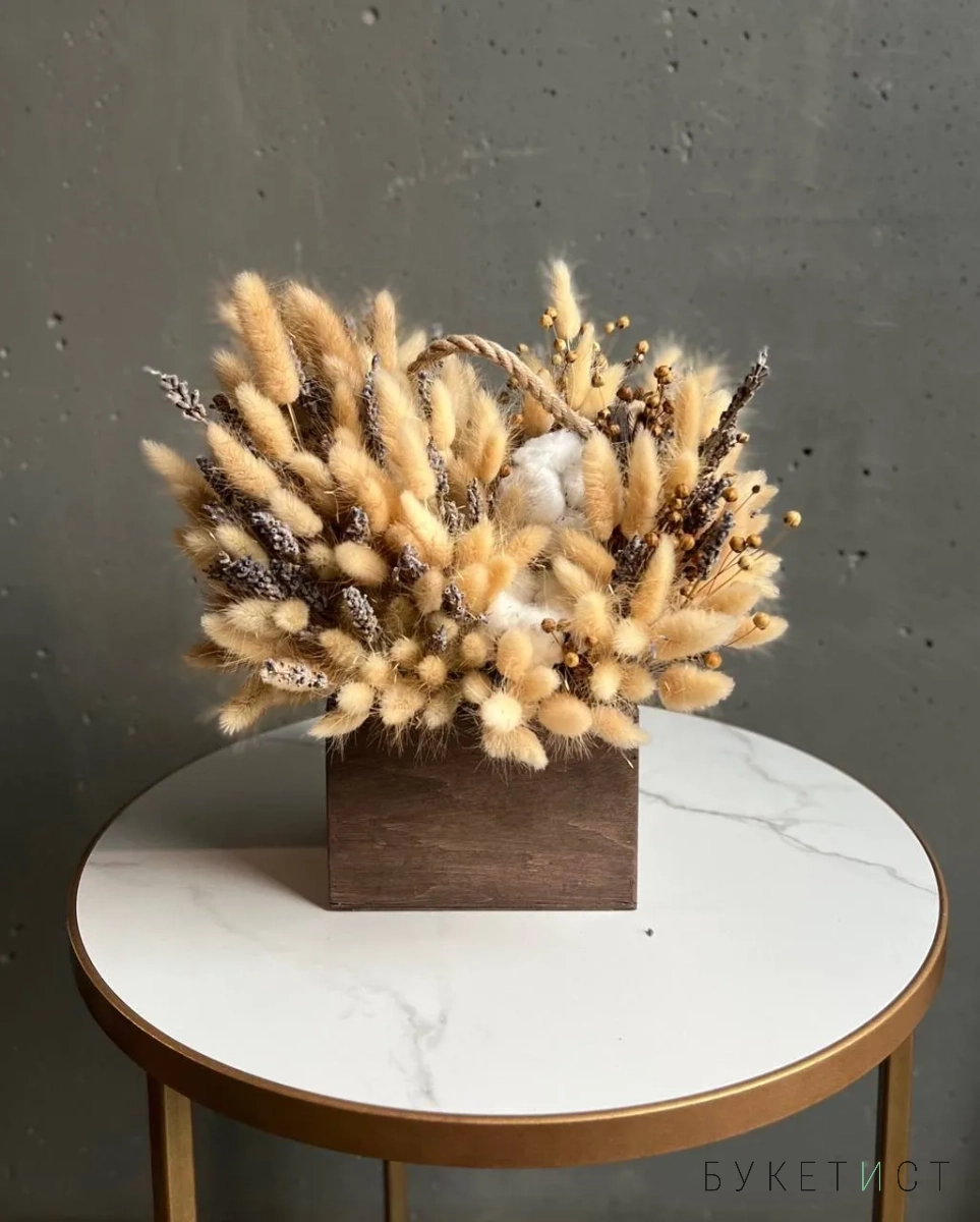 Натуральный букет сухоцветов со льном в деревянном ящике