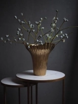 Золотистая ваза с широким горлом выполнена в современном стиле и отличается благородным мерцанием поверхности. Её лаконичная форма делает акцент на текстуре и цвете, добавляя интерьеру утончённости.
