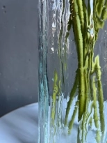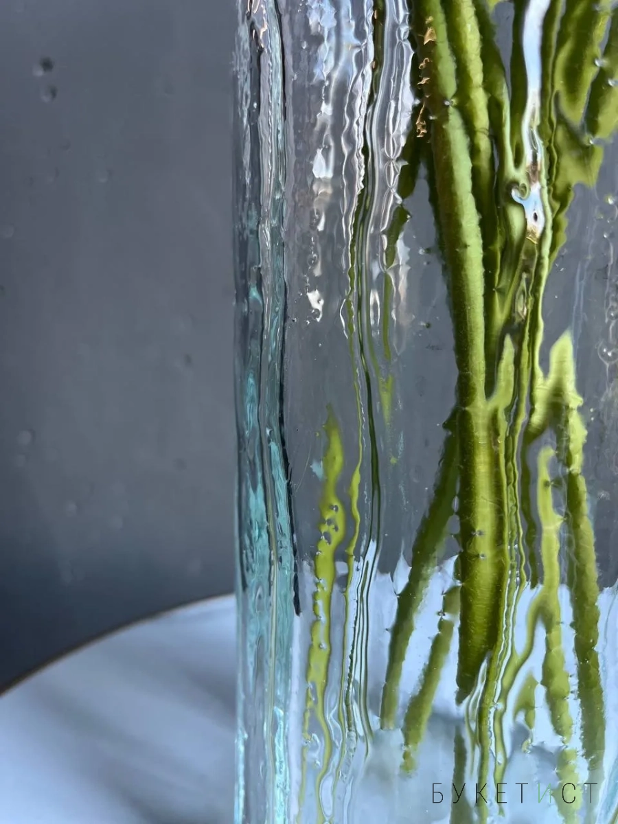 Высокая стеклянная ваза с рельефной волной - лаконичный элемент в современном интерьере. Её плавные линии подчёркивают вертикаль композиции.
