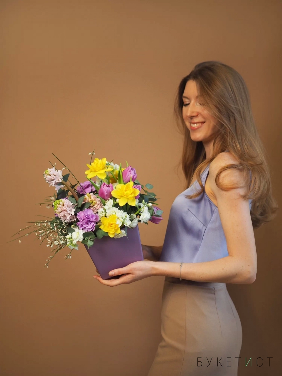 В составе: пионовидный тюльпан сорта Дабл Прайс, ароматный гиацинт, желтый нарцисс, сиреневая гвоздика, ароматная маттиола, весенние веточки генисты и эвкалипт.