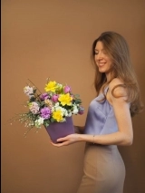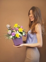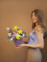 Весенняя композиция в стильной шляпной коробке. Цветы установлены в оазис (флористическая губка), требуют умеренного полива раз в два дня.