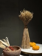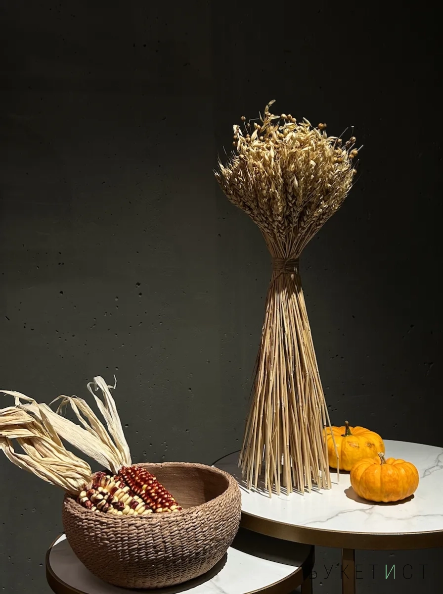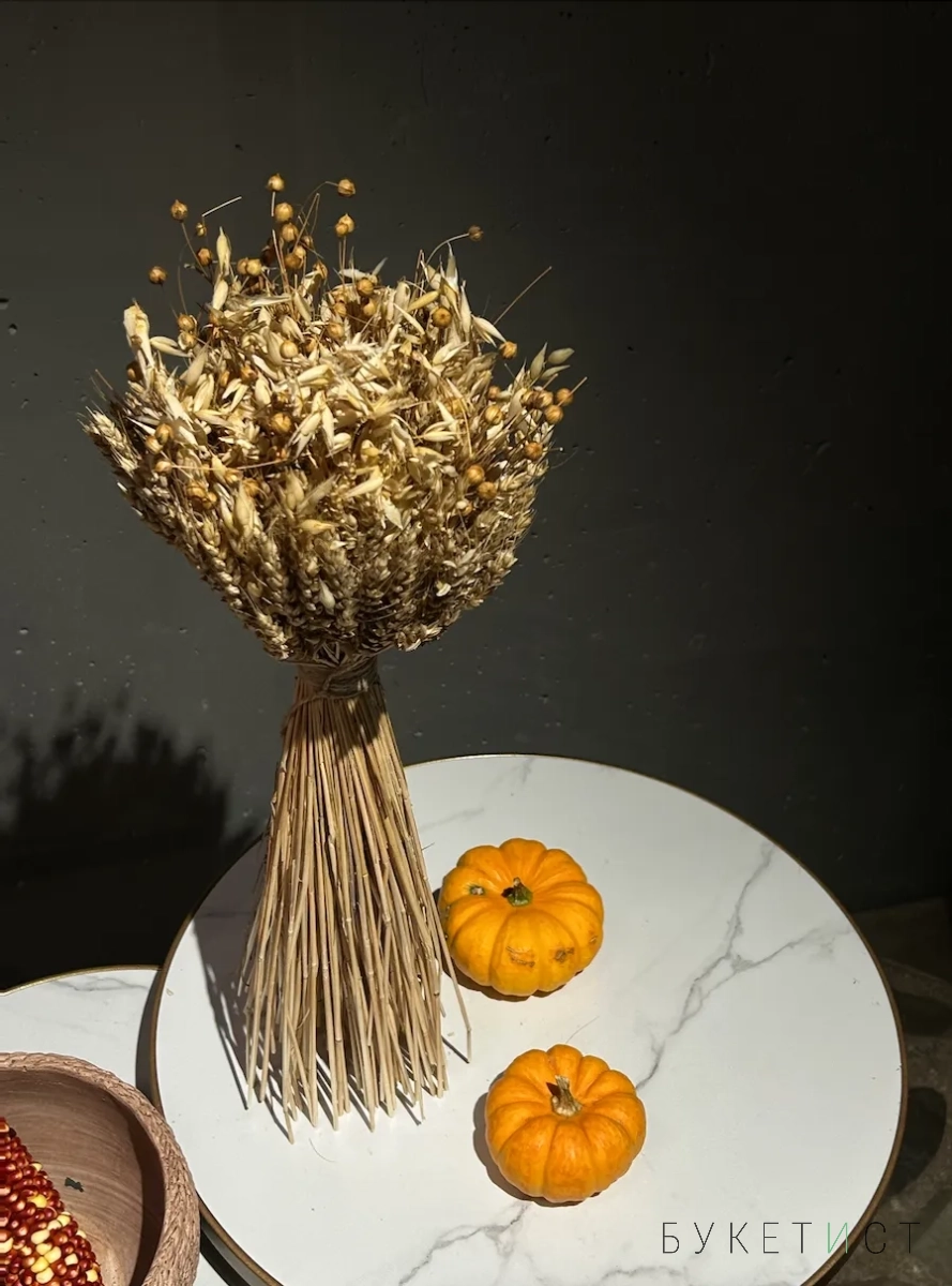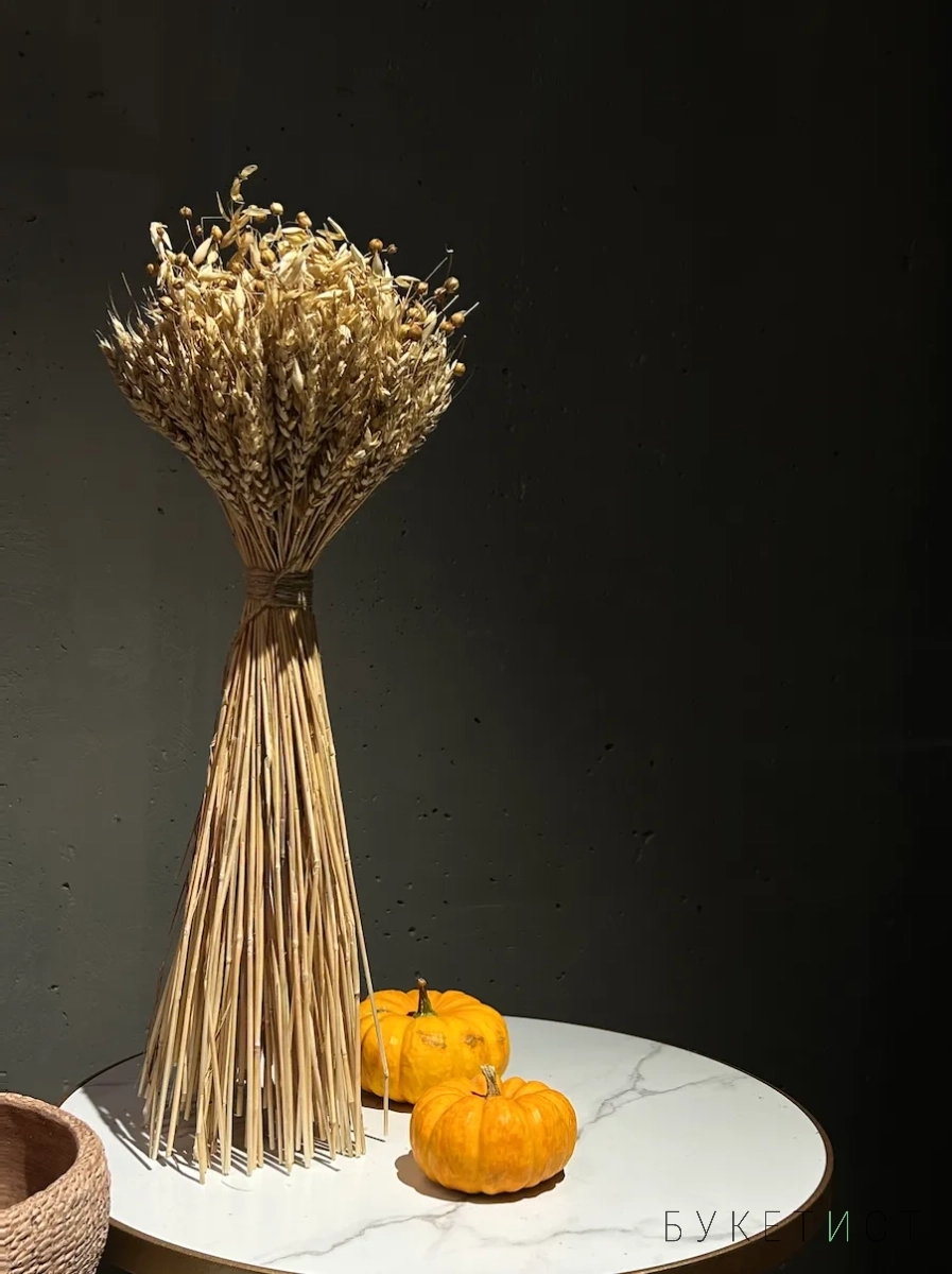 В составе букета: веточки пшеницы, лён, овёс.