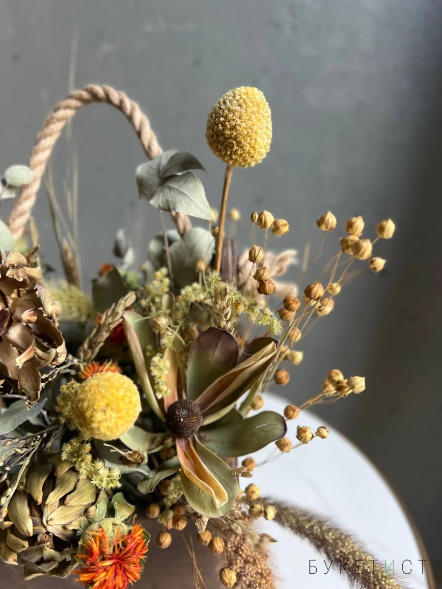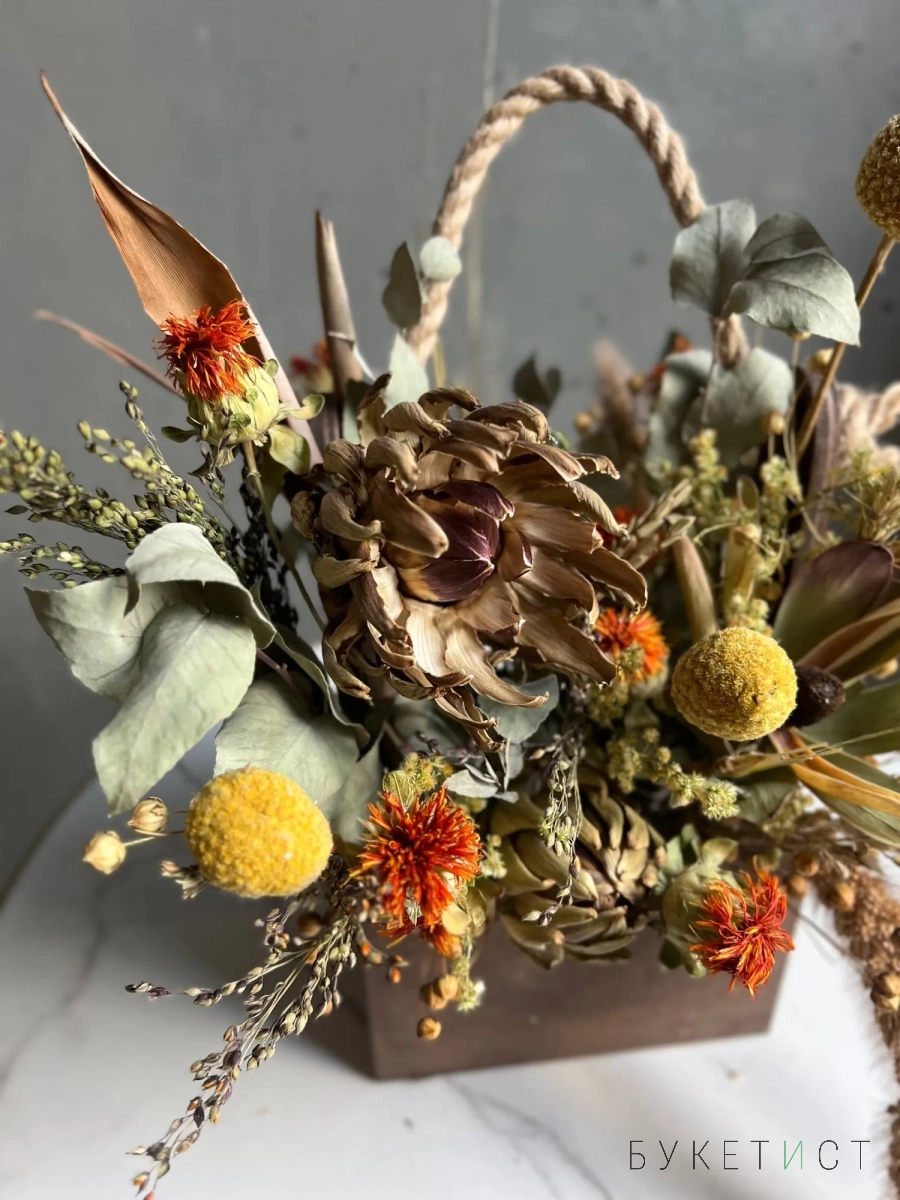 Цветы не нуждаются в дополнительном уходе или поливе, композиция не осыпается и не теряет своей формы - будет радовать вас долго-долго.