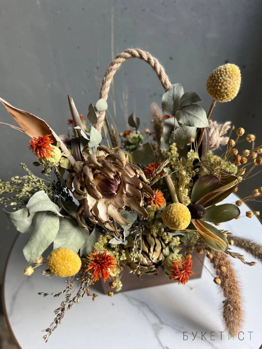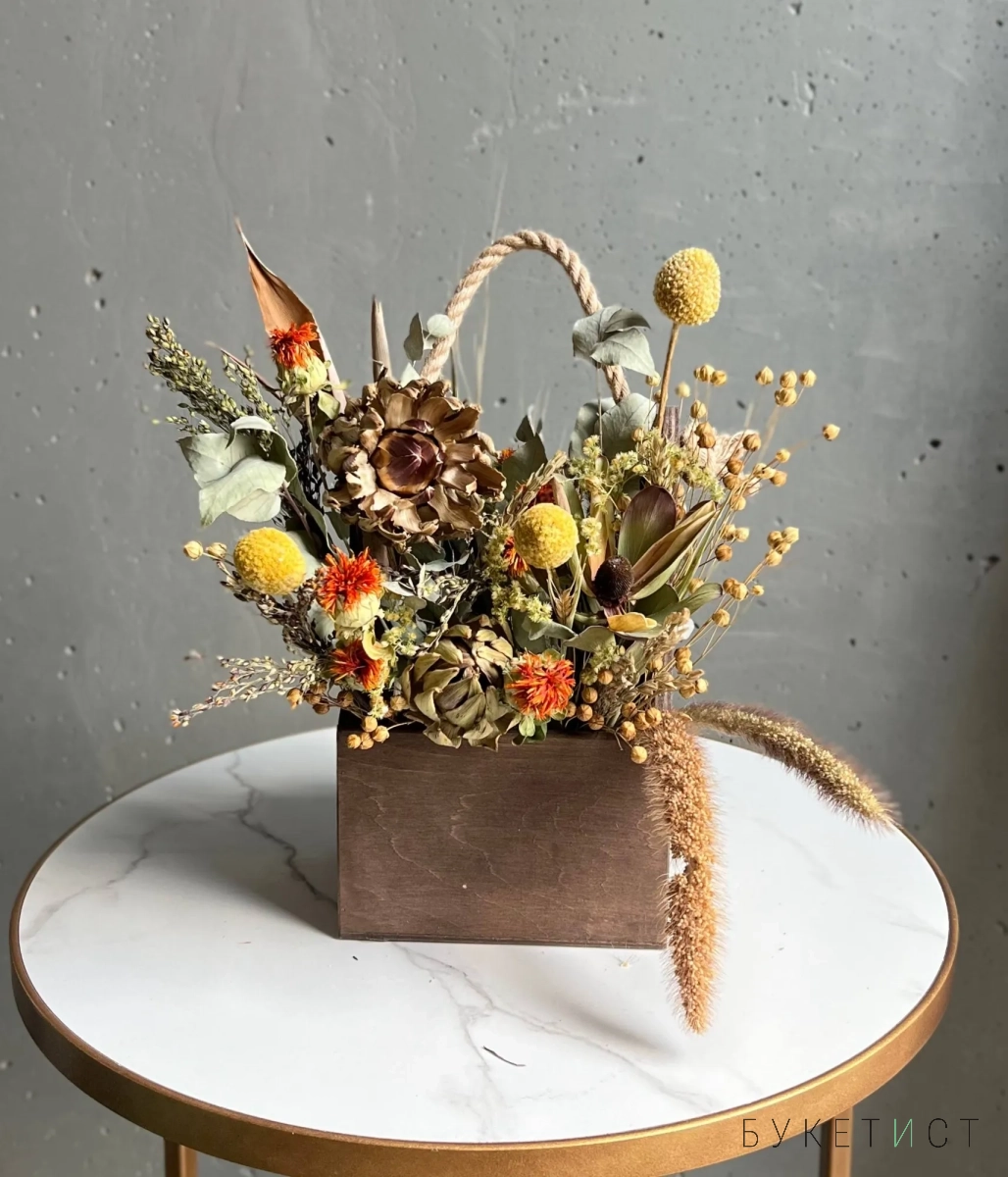 Интерьерная композиция в деревянном ящике с таким составом: лагурус, русккус, артишок, лен,краспедия, листья стрелиции, эвкалипт.