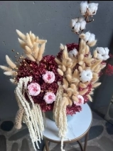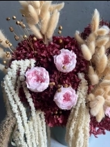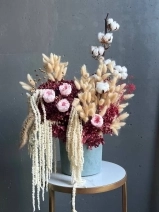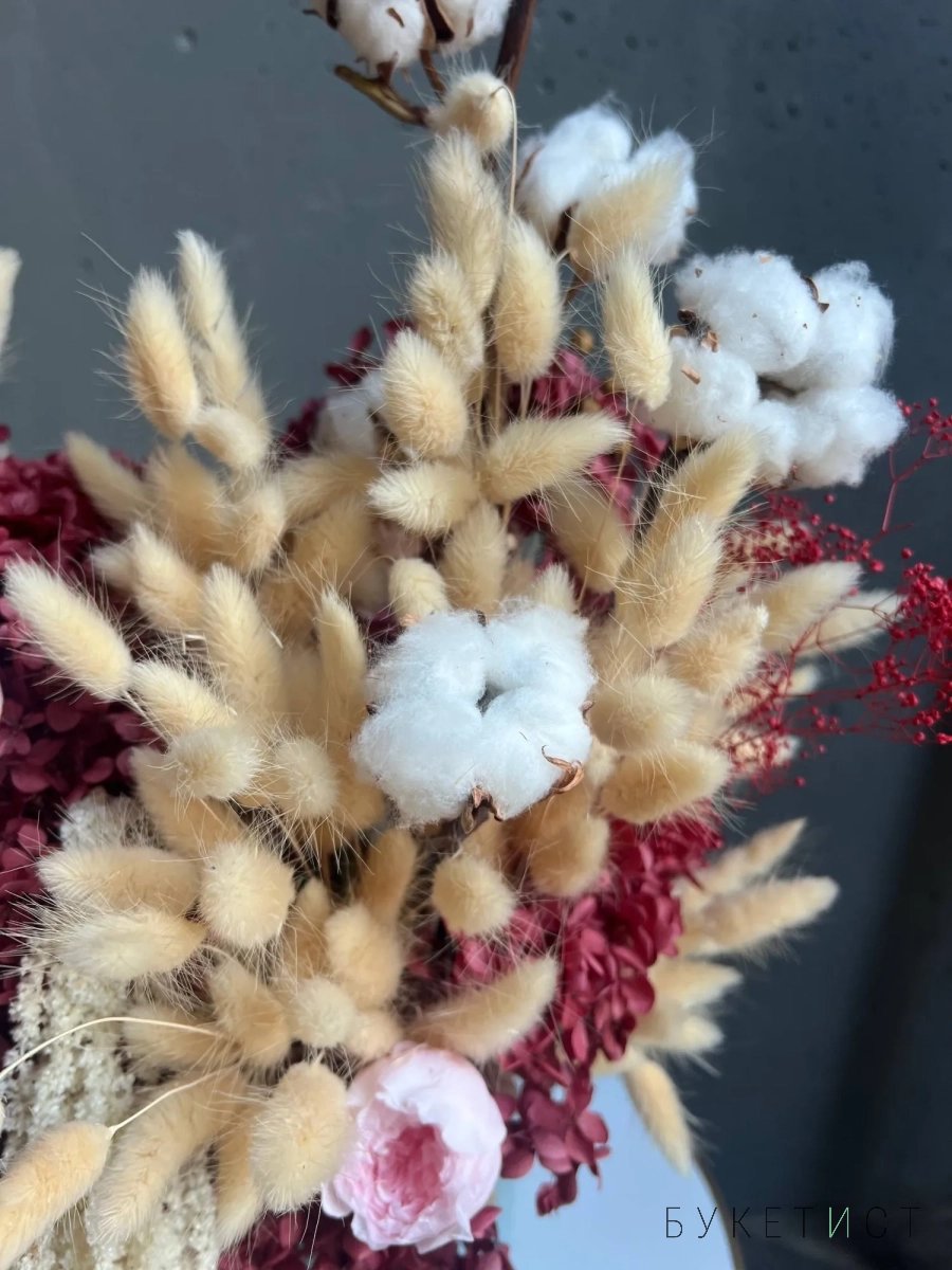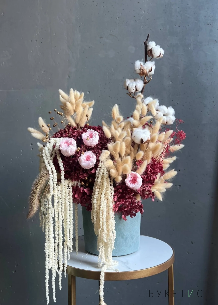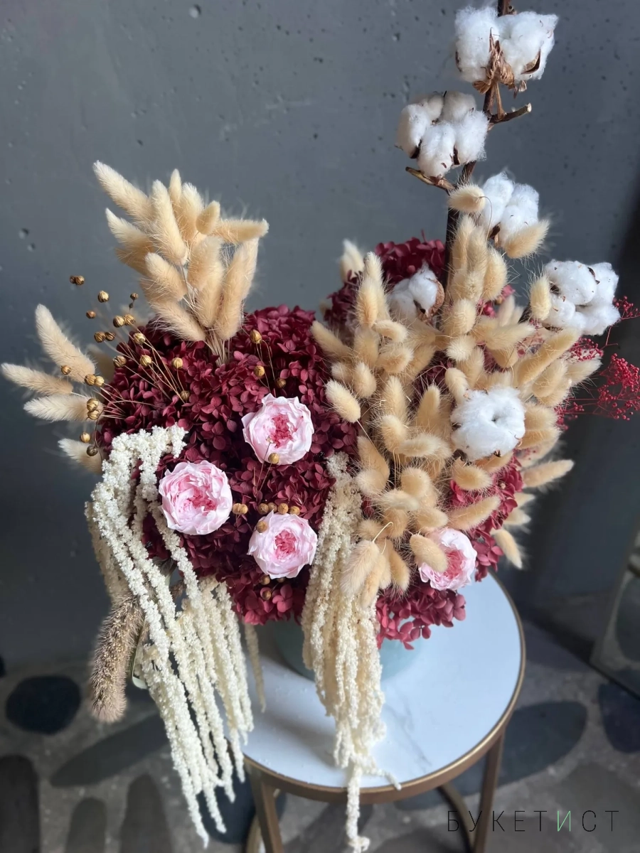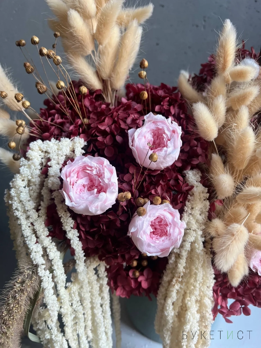 Собран из стабилизированных цветов, высушенных естественным путем профессиональными руками наших флористов. В состав композиции входят: высушенные метельчатые гортензии, стабилизированные розы, амарант, лагурус, хлопок