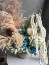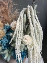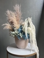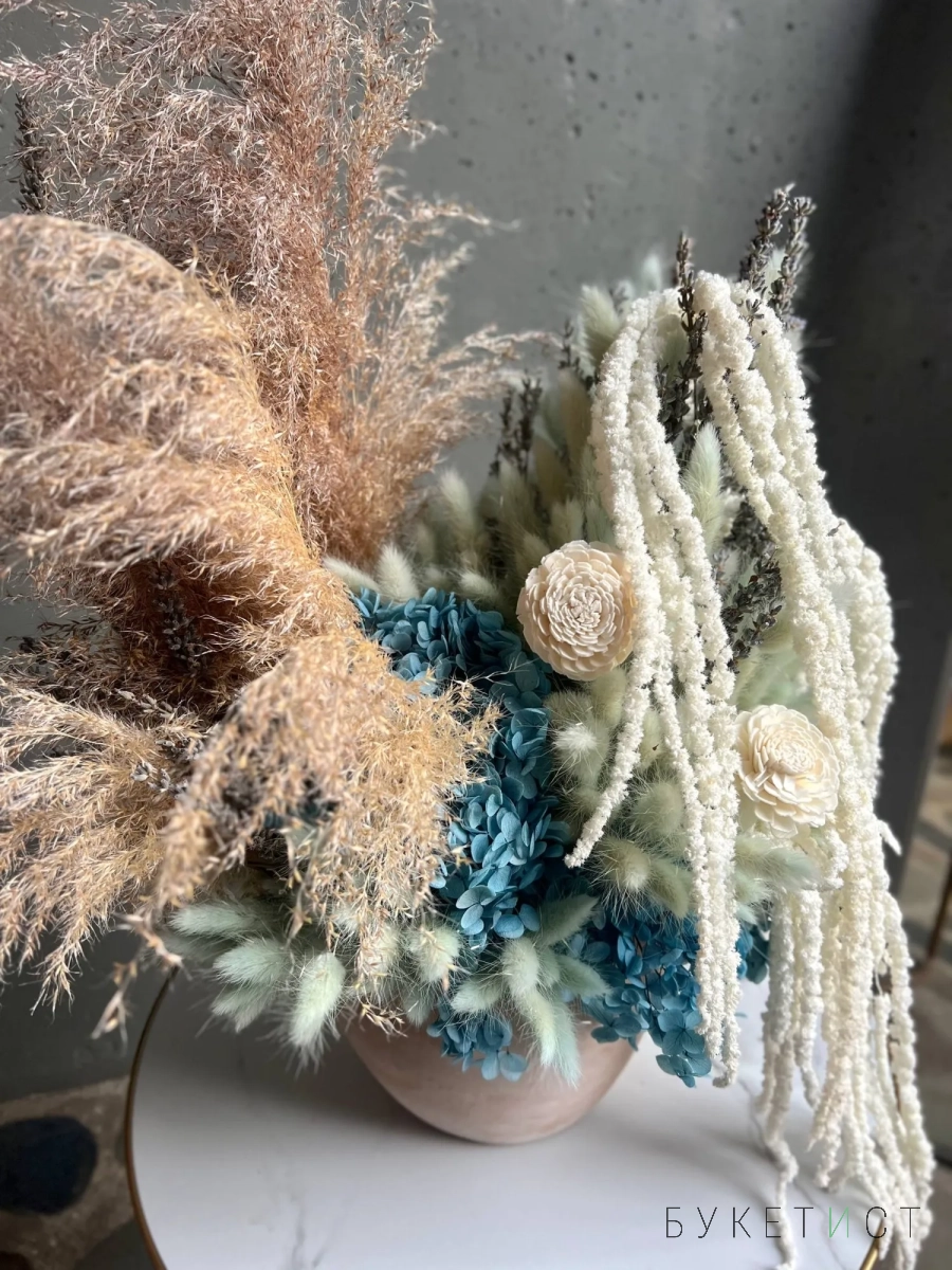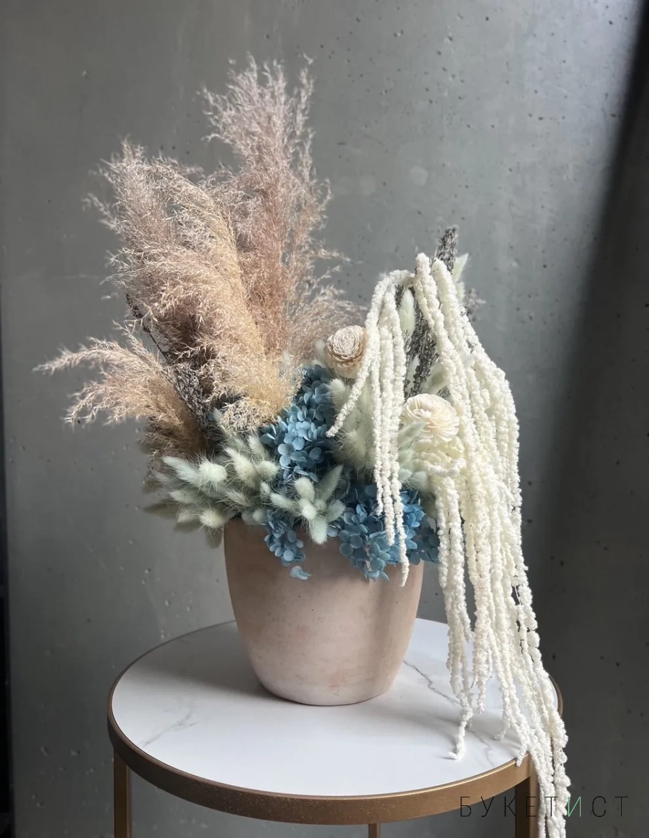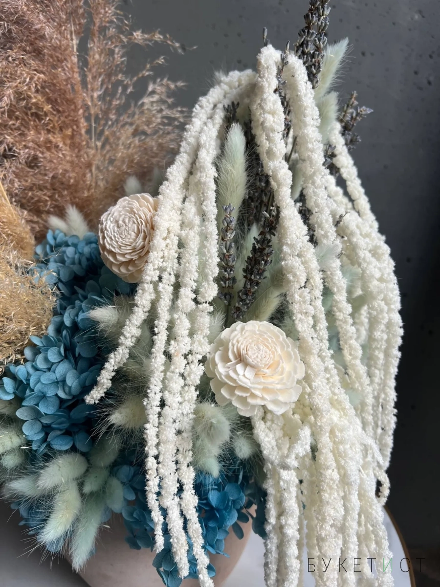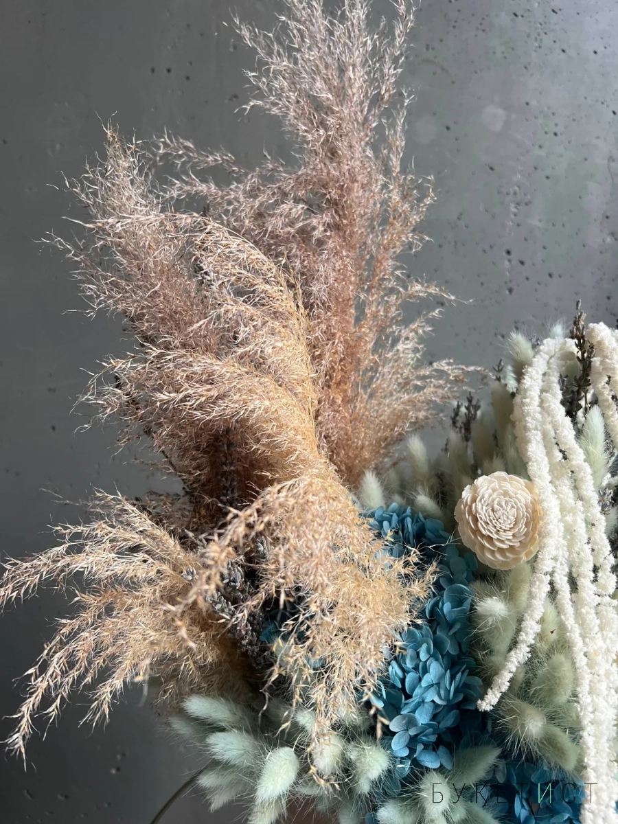 Собран из стабилизированных цветов, высушенных естественным путем профессиональными руками наших флористов. В состав композиции входят: высушенные метельчатые гортензии, кортадерия, деревянные цветы, лагурус.