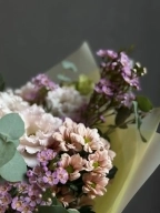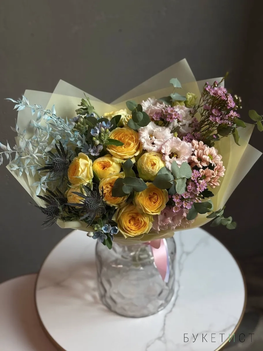 В составе: пионовидные розы, эустома, хризантема, оксипеталум, эрингиум, шамелациум, рускус и веточки эвкалипта.